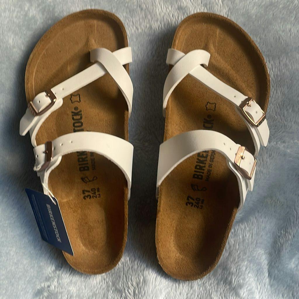 Supremely comfortable with sophisticated, crisscross straps, the Mayari redefines the thong sandal with a single toe loop. The style comes in smooth Birkibuc® for a brushed, nubuck-like finish. Complete with classic BlRKENST0CK design elements, like adjustable buckle closures and a contoured footbed for the ultimate in support.